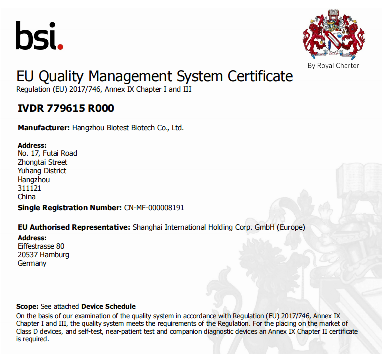 Under the background of the implementation of IVDR regulation, the EU regulatory requirements for in vitro diagnostic medical devices have become more stringent and complex. Biotest always stands at the forefront of the industry, quickly adapts to regulatory changes, drives development with innovation, constantly breaks through technical bottlenecks, ensures that its products comply with international high-level standards, and successfully passes the audits of many notified organizations, which shows the company's perfect quality management system and strong market resilience. In the future, Biotest will continue to uphold the core concepts of innovation, quality and compliance to provide global customers with more high-quality and reliable in vitro diagnostic solutions.