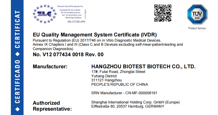 近日,杭州博拓生物获得由欧盟权威公告机构TÜV南德意志集团在IVDR法规下签发的CE认证证书(IVDR),该证书涵盖了公司首批69项产品。首批获证产品主要集中在药物滥用检测领域,同时也涵盖了传染病检测、女性健康检测和肿瘤标志物检测等领域的一些项目。这批证书的签发使得博拓生物成为国内首批拥有较为齐全的、经过欧盟IVDR认证的药物滥用检测产品的厂家之一。