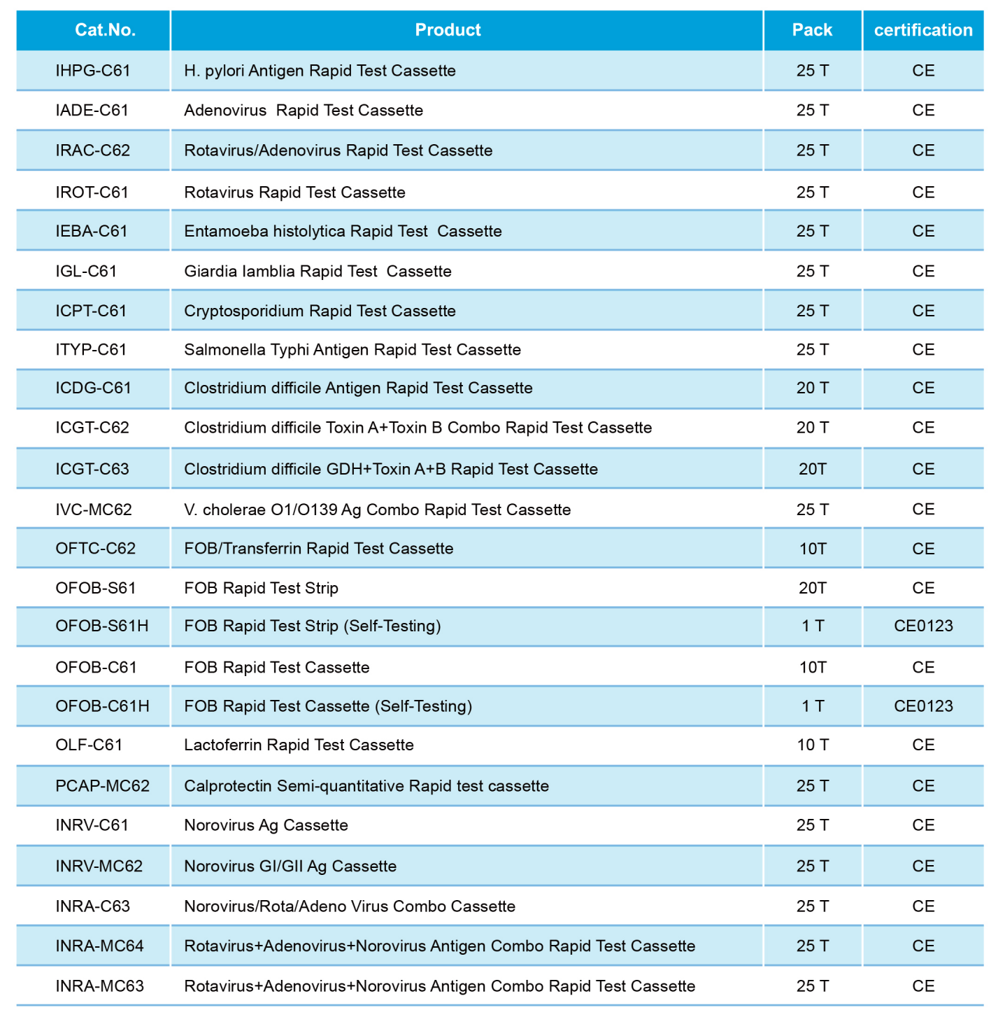 We provide Gastrointestinal Disease Series Tests dectecting with feces specimen including H.pylori, Rotavirus, Adenovirus, Norovirus, Giardia lamblia, Cryptosporidium, Entamoeba Histolytica, Calprotectin, Transferrin, Lactoferrin, Feces Occult Blood, Salmonella Typhi, V.cholerae 01/0139, Clostridium Difficile GDH+Toxin A+B.