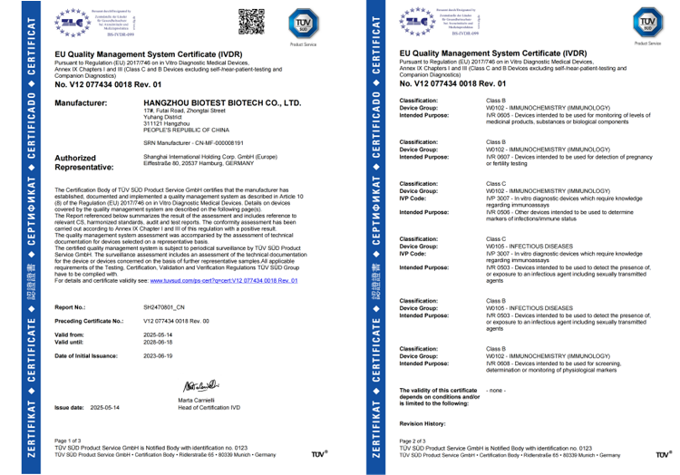 近日,博拓生物旗下54款产品新获欧盟CE IVDR认证。新认证证书由欧盟权威公告机构TÜV南德意志集团在IVDR法规下签发。这是博拓生物继23年6月首批产品获得IVDR认证以来又一突破性的进展。截止目前博拓生物获得IVDR认证的产品已达到126个。公司获证产品涵盖了药物滥用检测、传染病检测、女性健康检测、肿瘤标志物检测和炎症指标检测等多个应用领域。新证书的签发进一步巩固了博拓生物在全球快诊行业内欧盟CE IVDR认证方面的领先地位。
